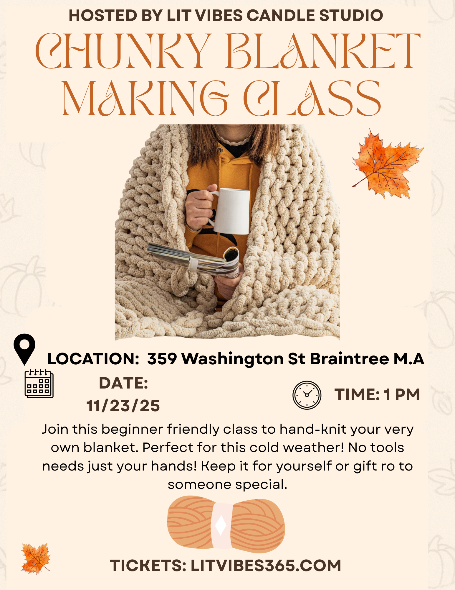 Join us for a cozy and creative day. Learn how to hand-knit your very own chunky blanket, perfect for snuggling up during colder weather.